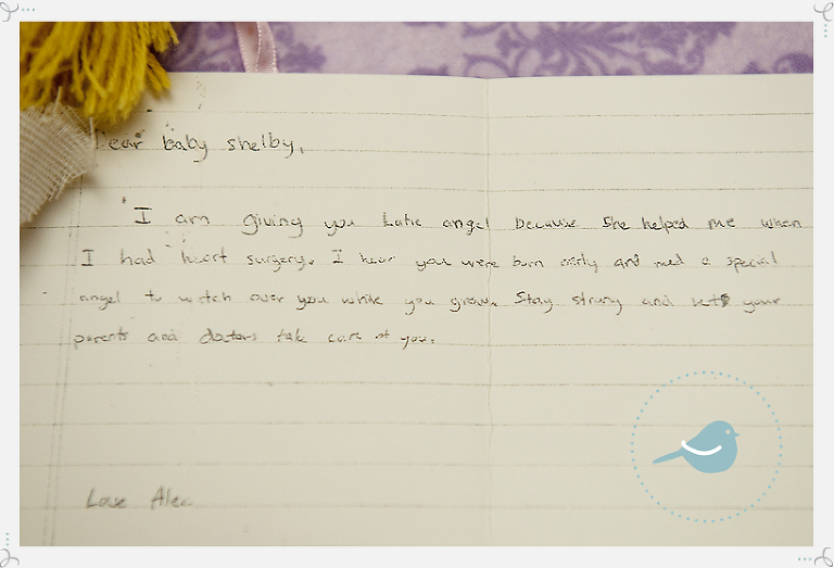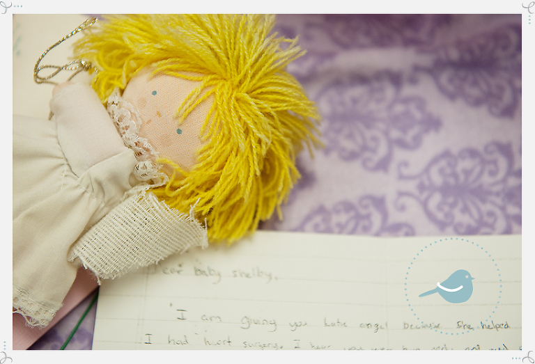 i also had to share the most wonderful story of katy the angel…you will see her below. angel katy is 45-50 years old…literally. she originally belonged to michael. michael was born with downs syndrome. he had many heart surgeries and at the age of 30 passed away. before he died he passed the little angel doll to his mom’s older sister. michael said it was his time to meet his real angel so he wanted katy to watch over other people here on earth. katy has been over the US, europe and even iraq with a soldier. her keeper is now alec who was born with a heart defect. alec is now 13 years old and has had several heart surgeries. he heard about shelby from his grandma and wanted angel katy to visit shelby. and, so it is here next to baby shelby that katy the angel sits. so incredibly heart warming…